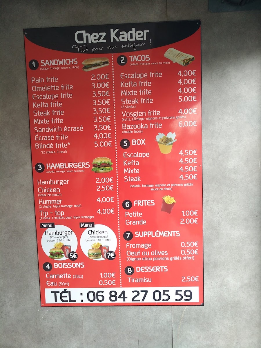 Welcome to Chez Kader, a culinary gem nestled in the heart of Illzach, France. Located at 2 Rue de Sausheim, this charming eatery offers a menu that beautifully marries traditional flavors with modern flair. When you step inside, the warm ambiance invites you to embark on a gastronomic journey.